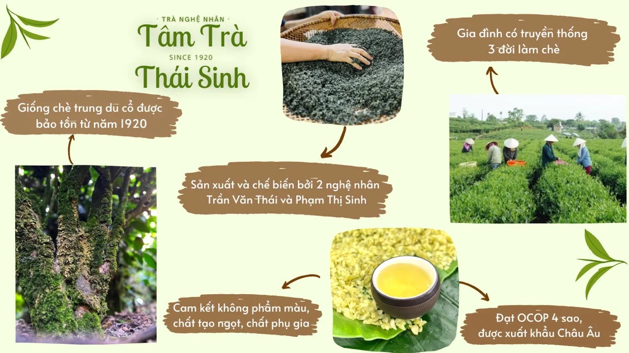 Với tất cả tình yêu, niềm tự hào, sự trân trọng đối với văn hóa thưởng trà nói chung và cây chè xanh Tân Cương – Thái Nguyên nói riêng, HTX Tâm Trà Thái luôn ý thức được sứ mệnh giữ gìn và nâng cao giá trị cây chè cổ Tân Cương, lan tỏa tình yêu dành cho đặc sản chè Thái Nguyên đến với bao người con đất Việt, đồng thời không ngừng đưa thức quà đặc sản quê hương đến gần hơn với bạn bè quốc tế, qua những sản phẩm đa dạng, chất lượng trong suốt hành trình hơn một thế kỷ qua.